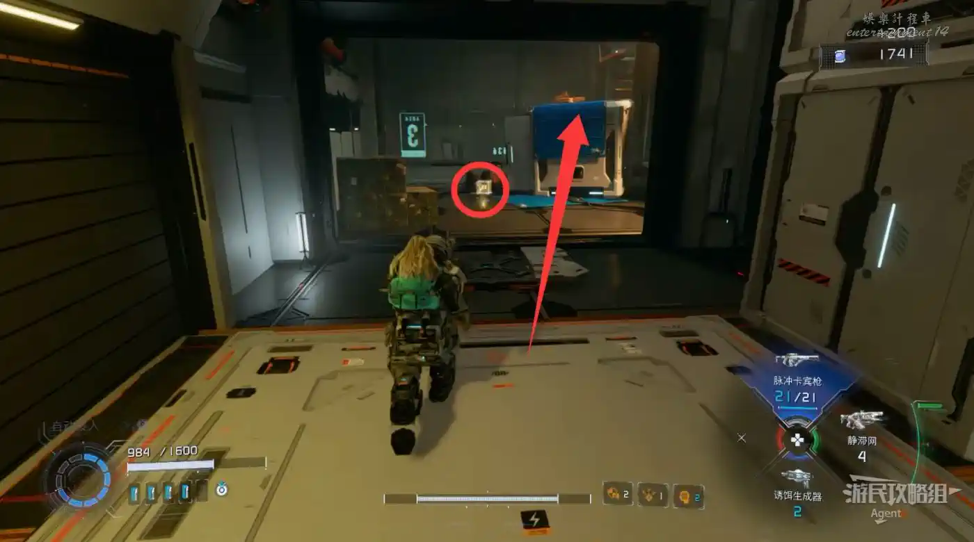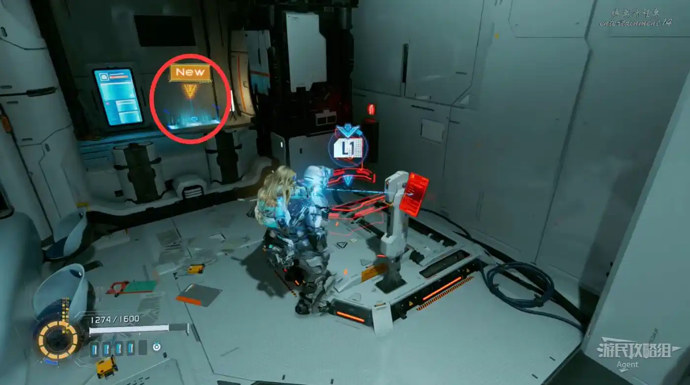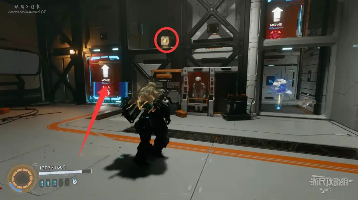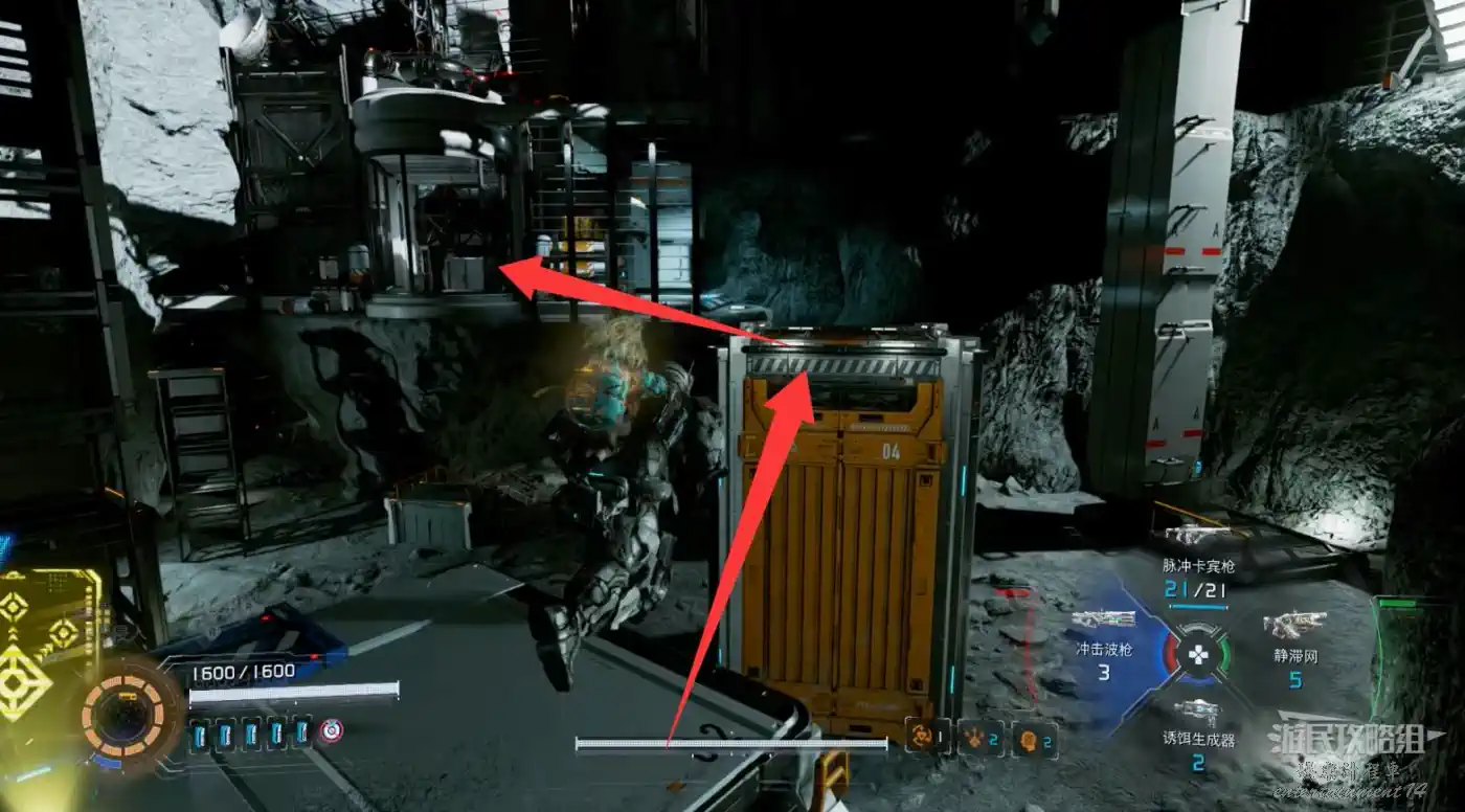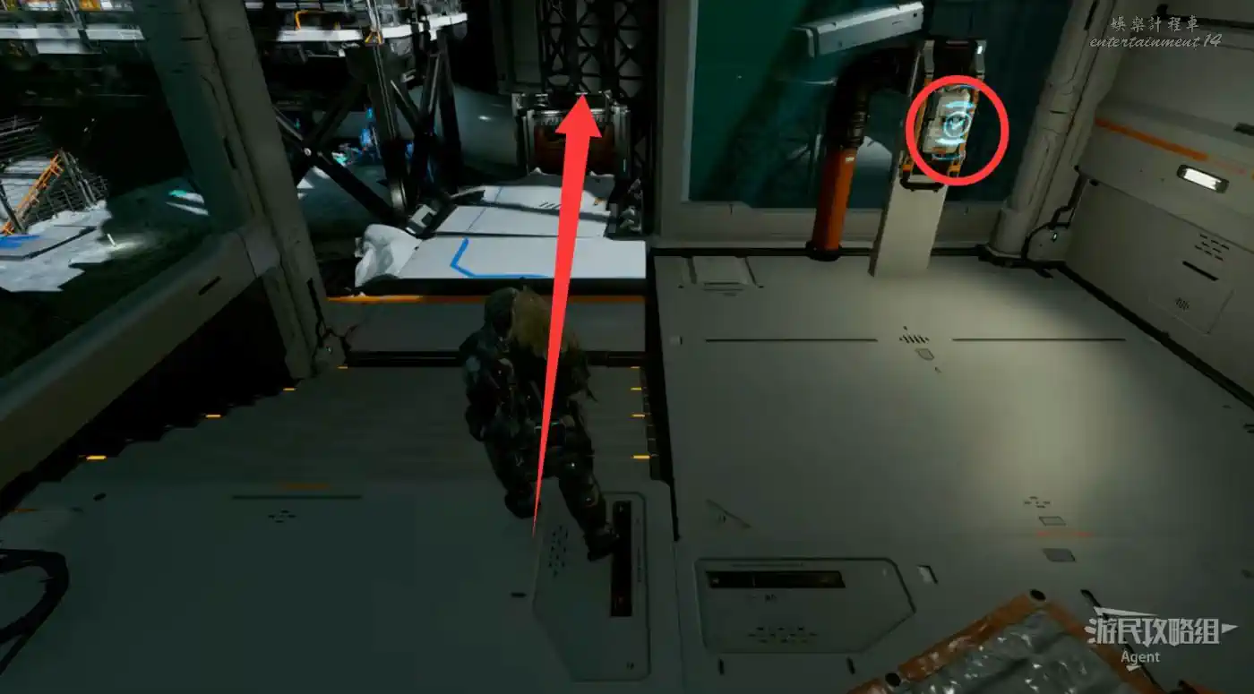 乘電梯到上層,跳下去拿到【武器】靜滯網,並破解紅圈。