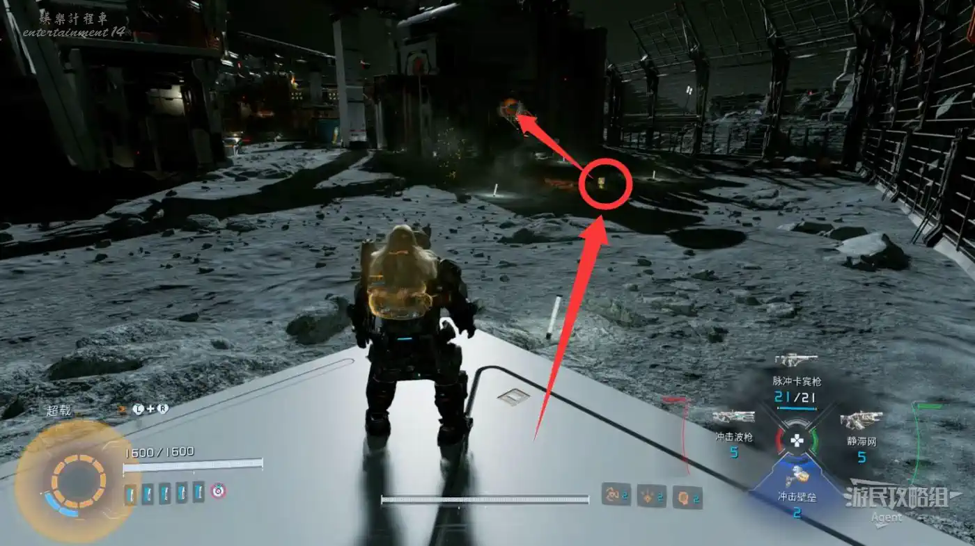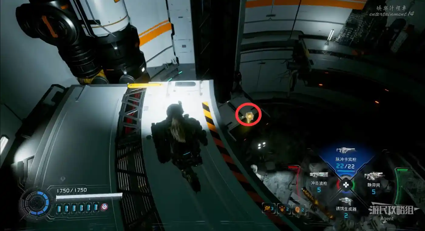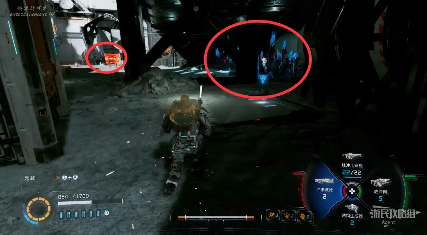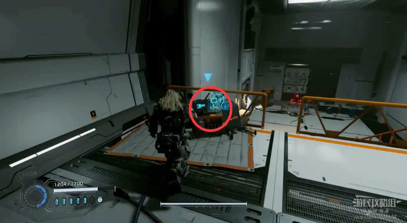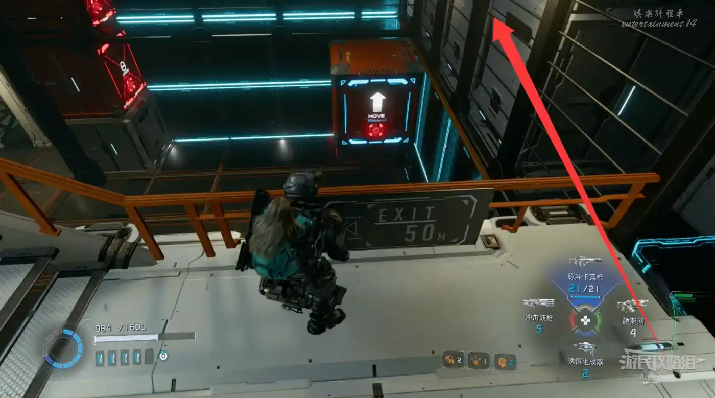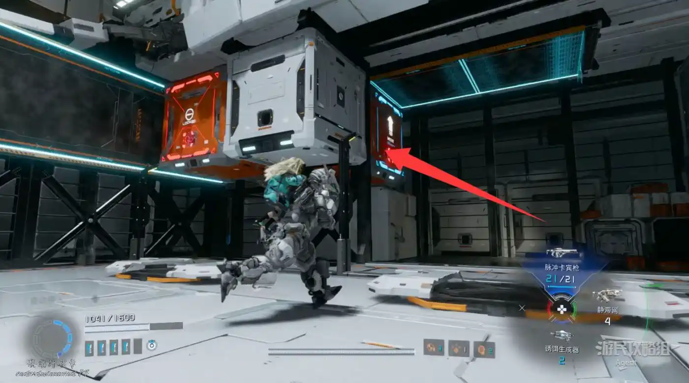 乘電梯到上層,跳下去拿到【武器】靜滯網,並破解紅圈。