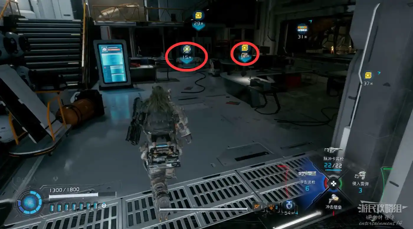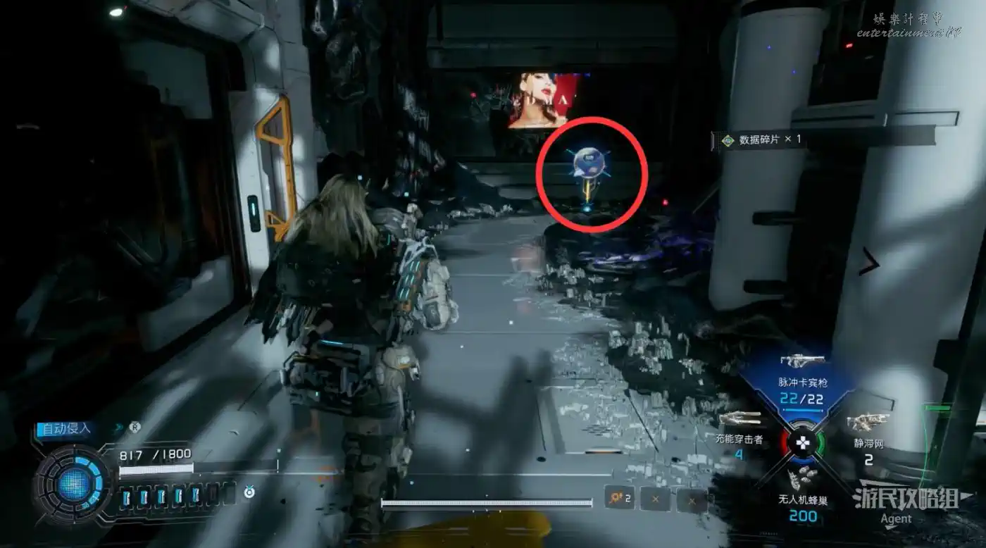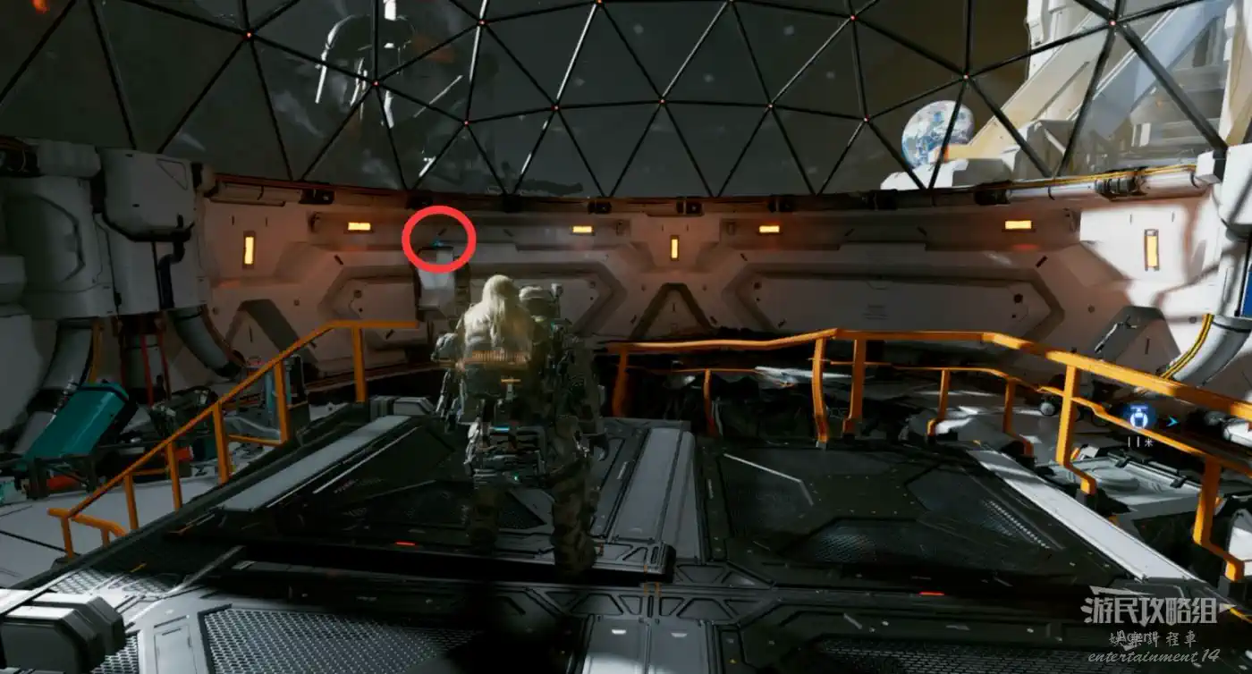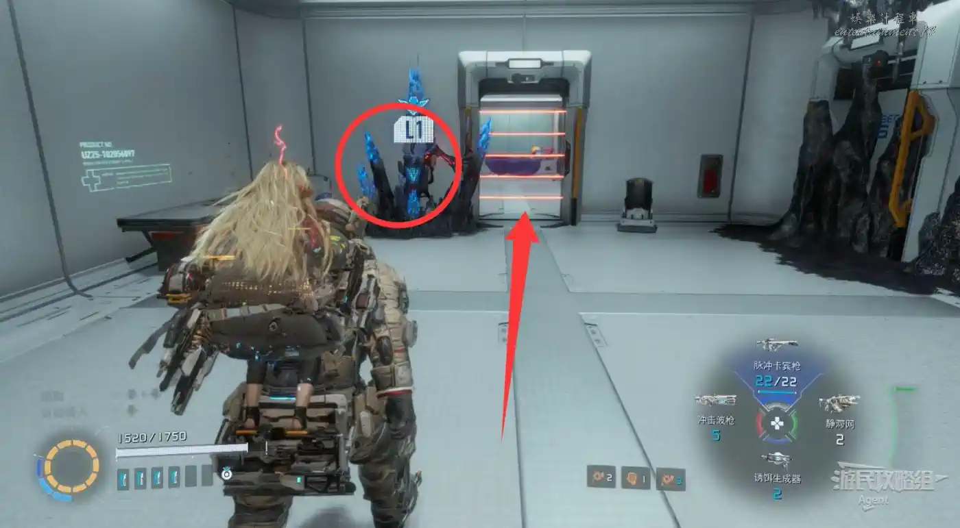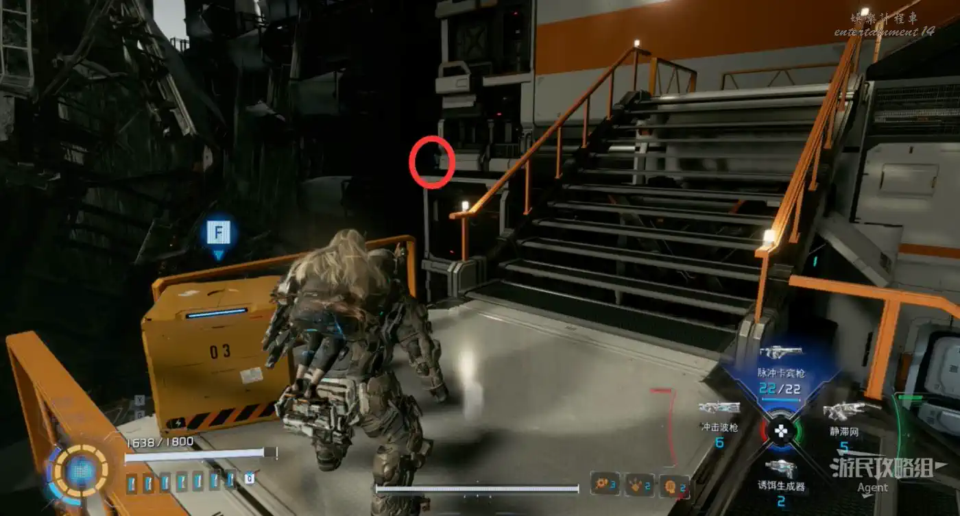 乘電梯到上層,跳下去拿到【武器】靜滯網,並破解紅圈。