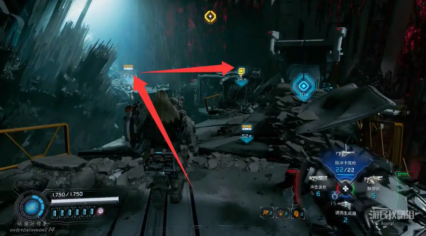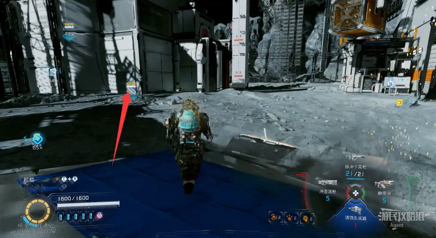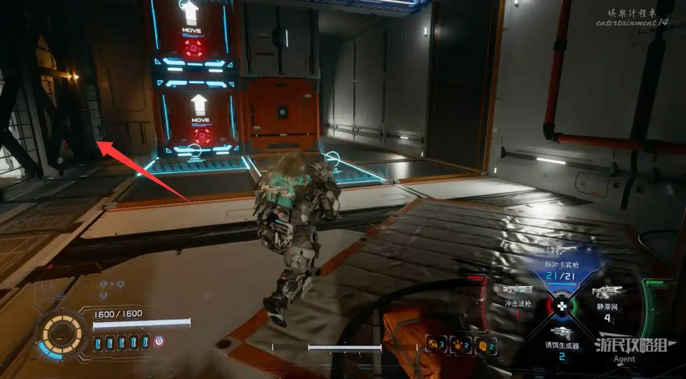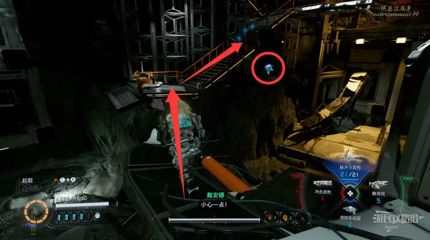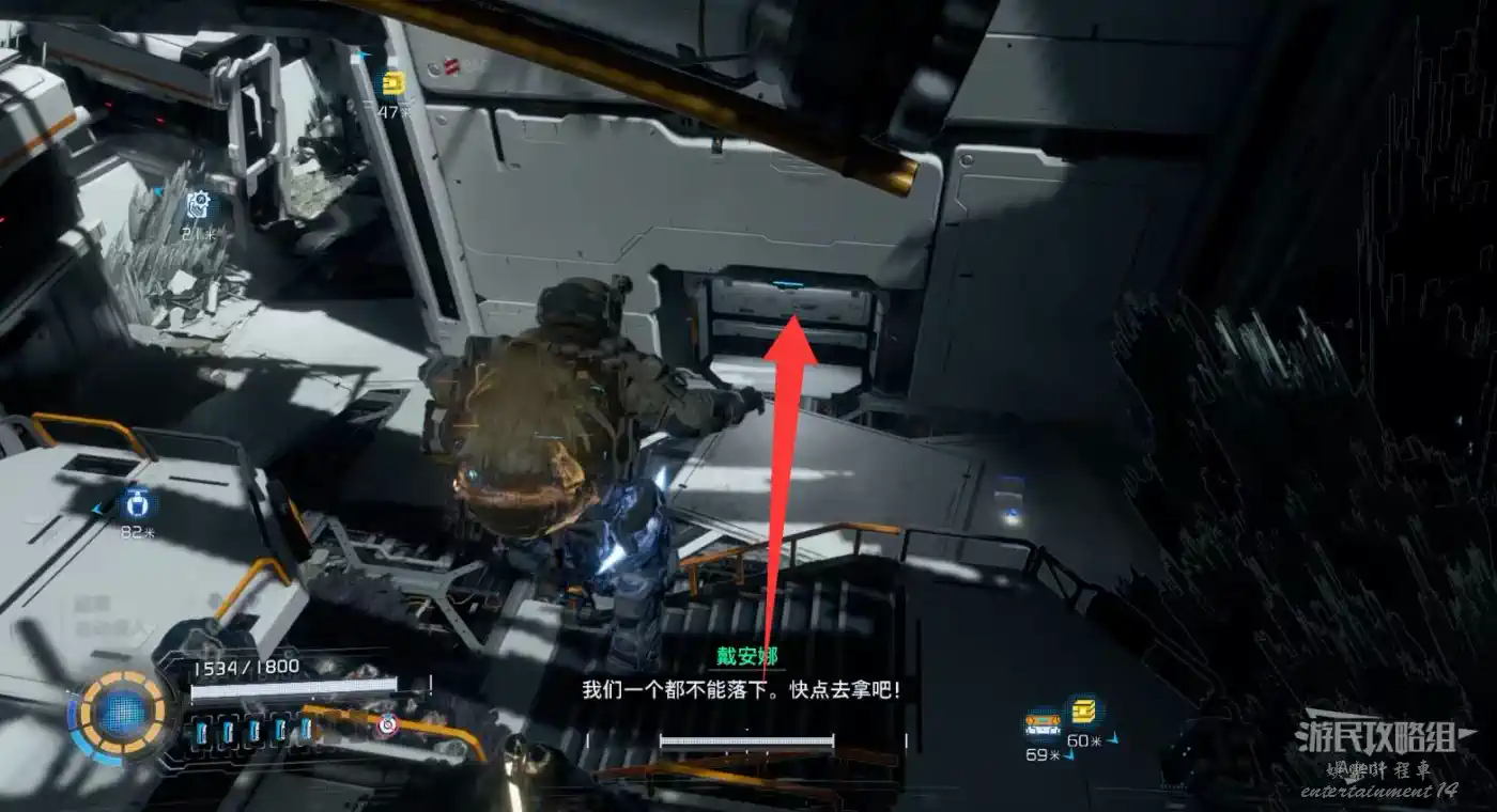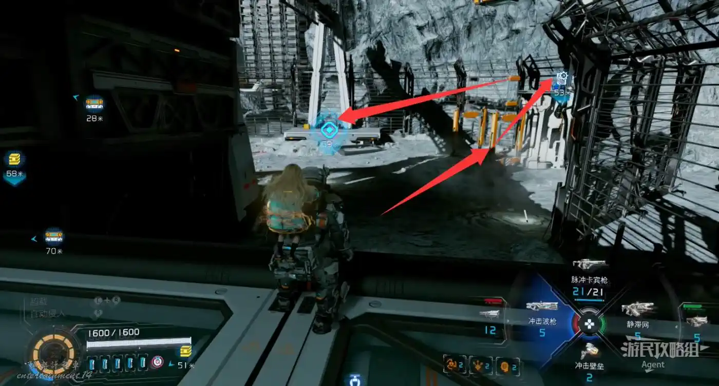 乘電梯到上層,跳下去拿到【武器】靜滯網,並破解紅圈。