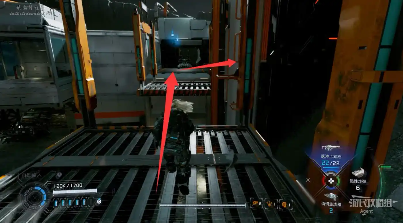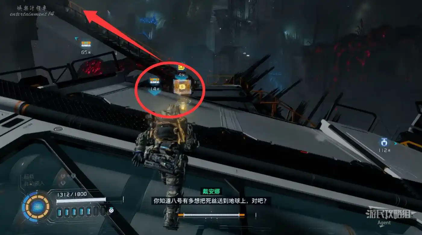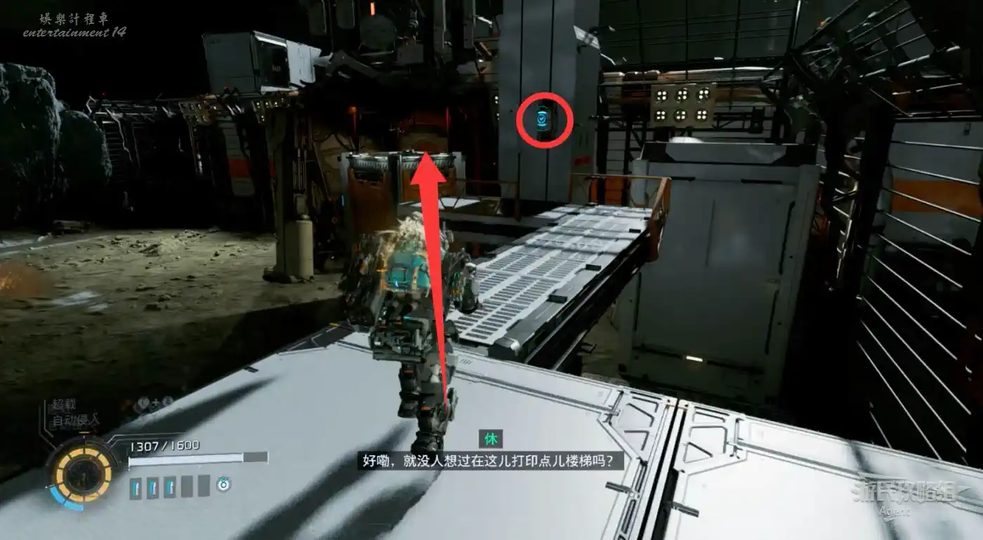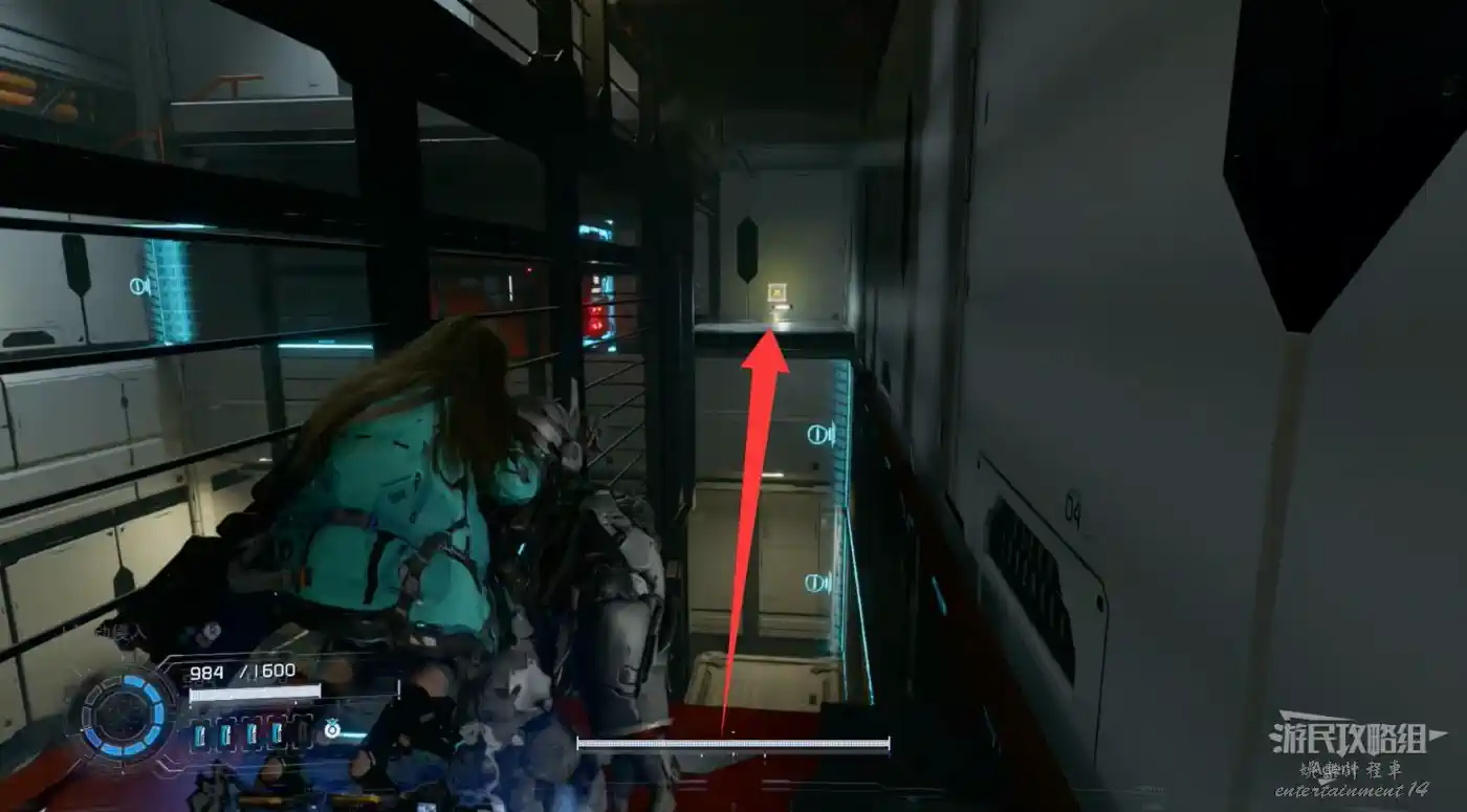 拿升級組件時看到那邊有東西,需要乘左下方的電梯到上層,從上層跳過去。