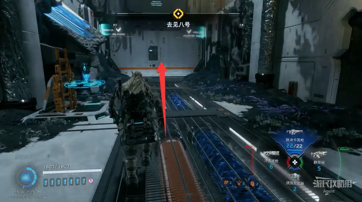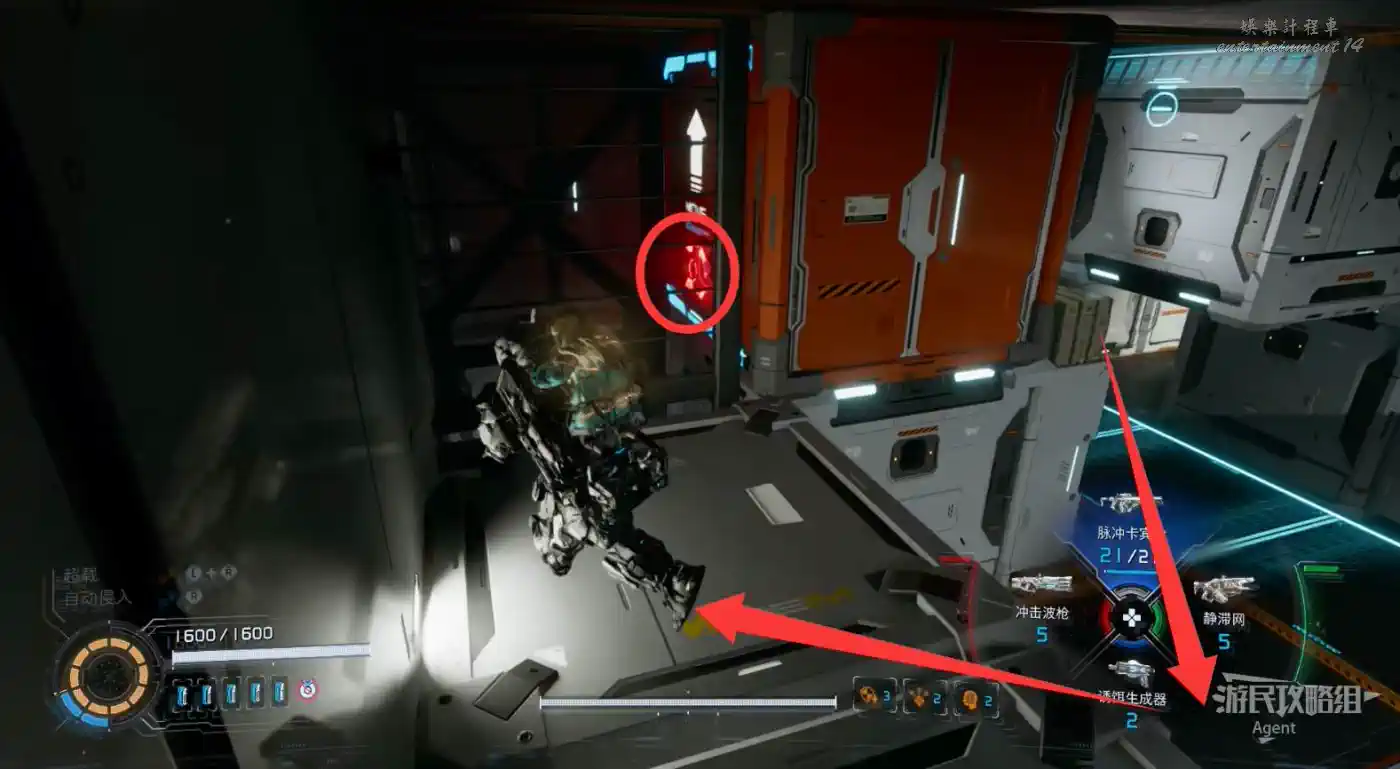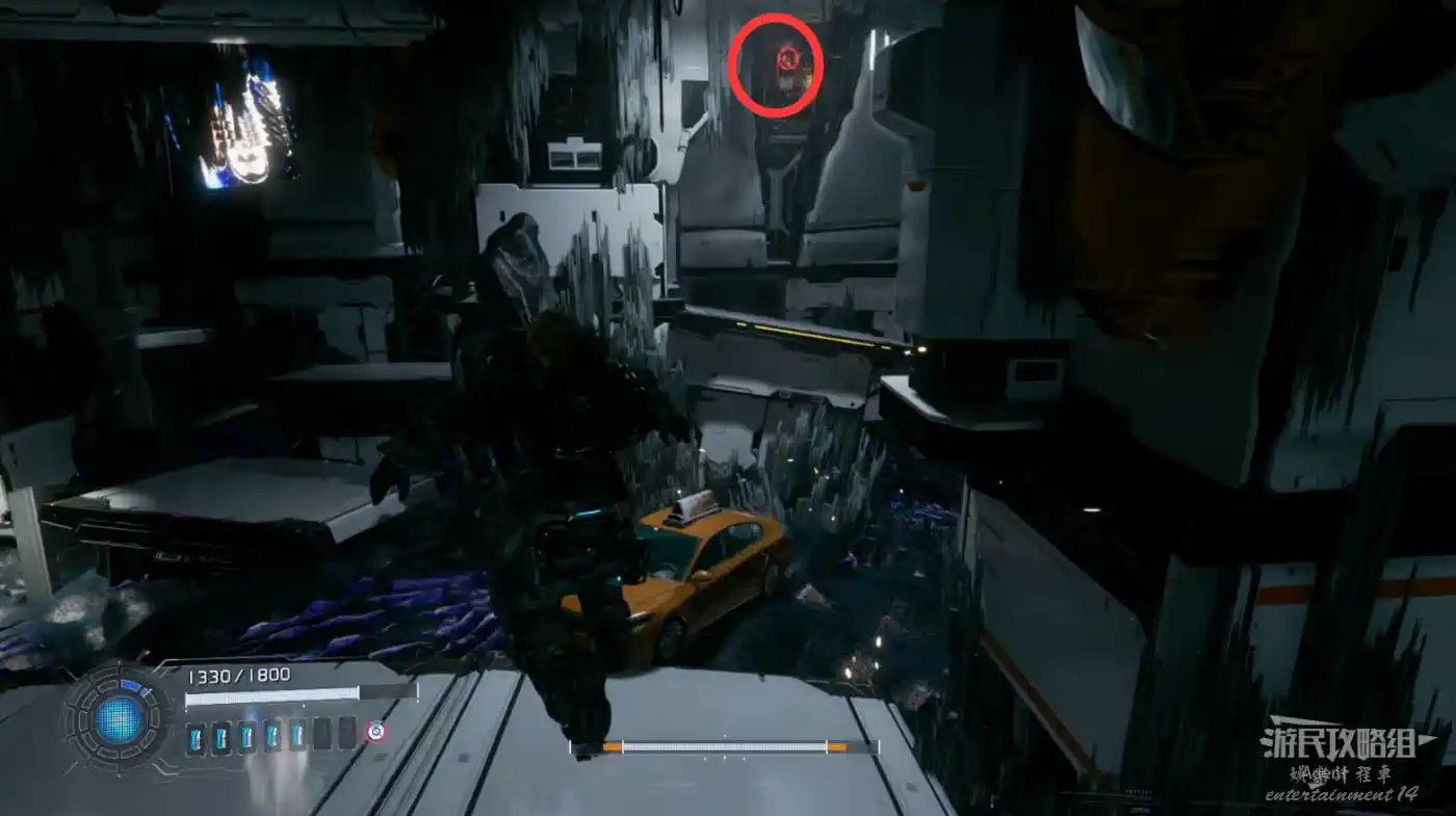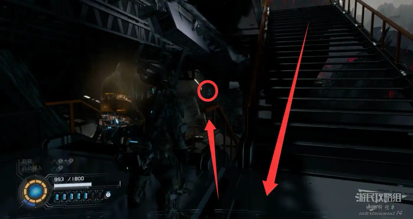 小貓劇情後,遇到蜘蛛機器人,前面走到頭角落裡有個【升級組件】,然後走下圖右邊的門。