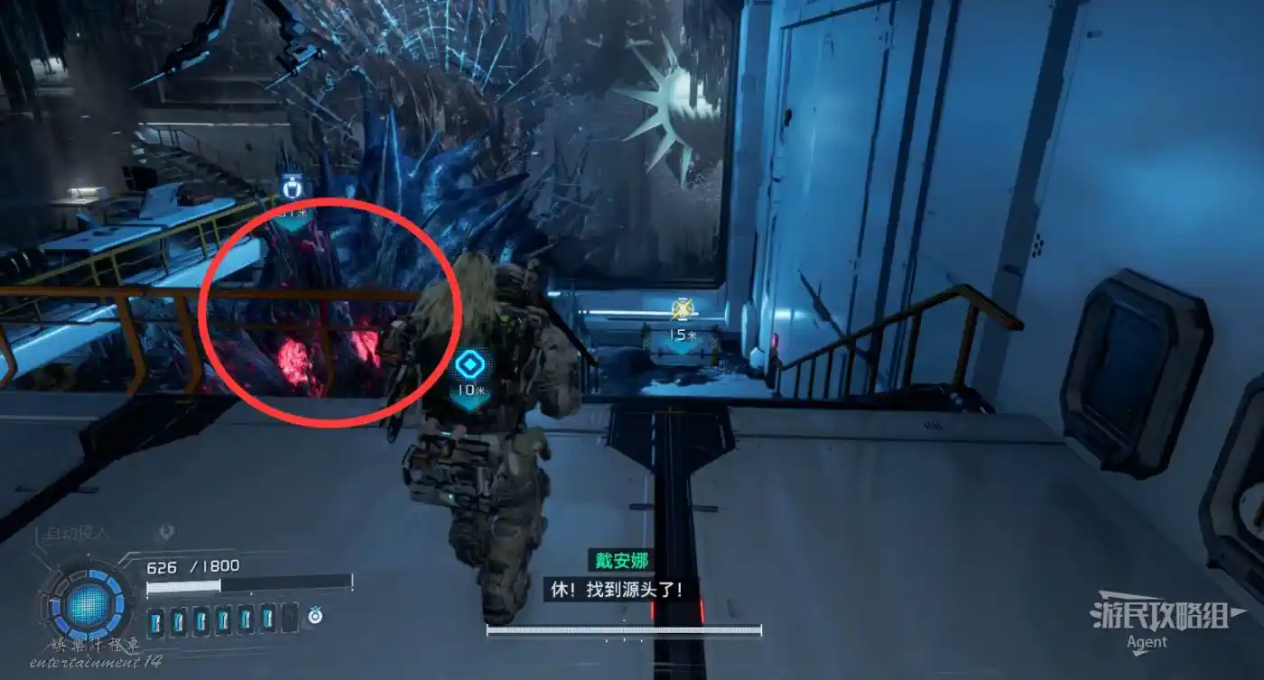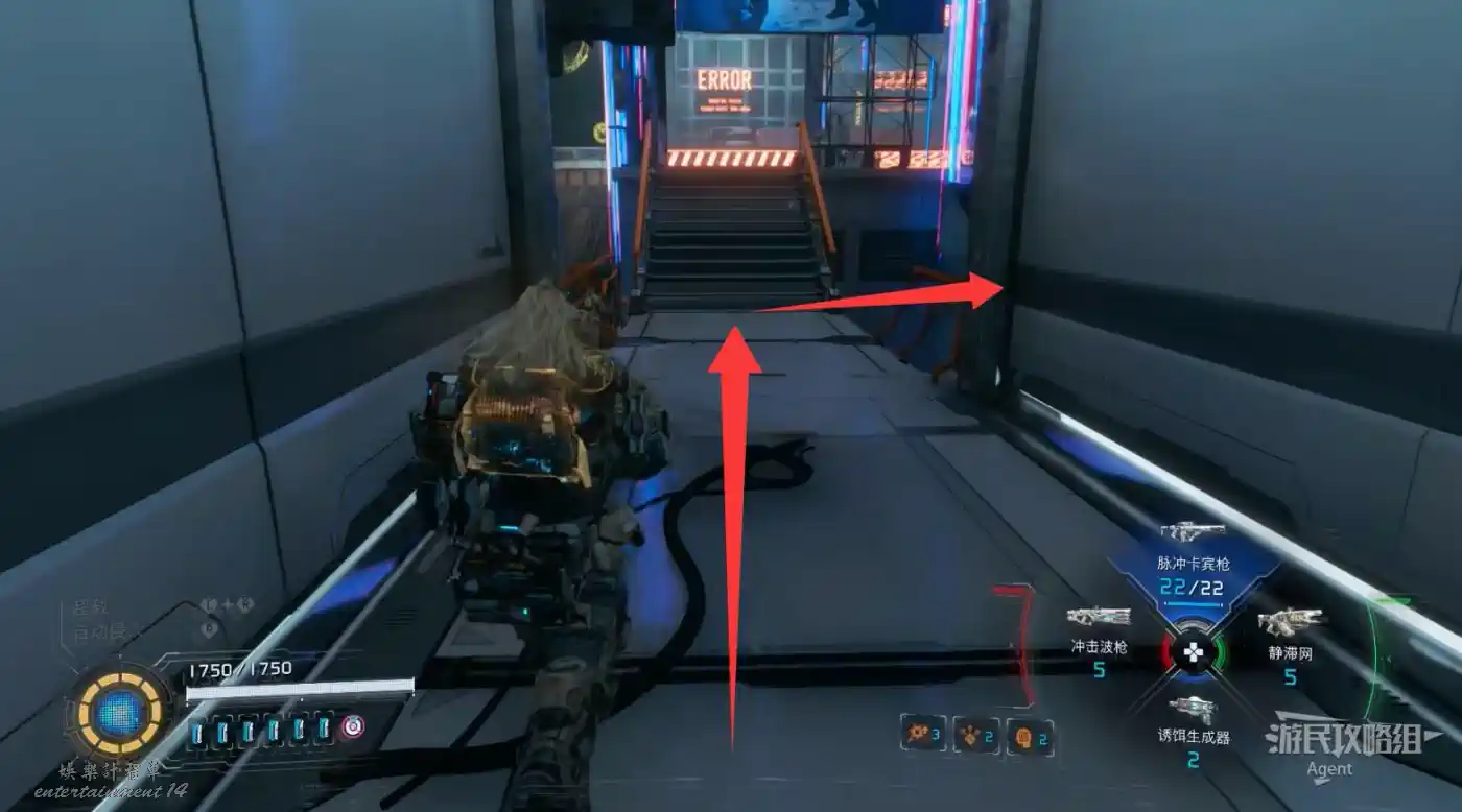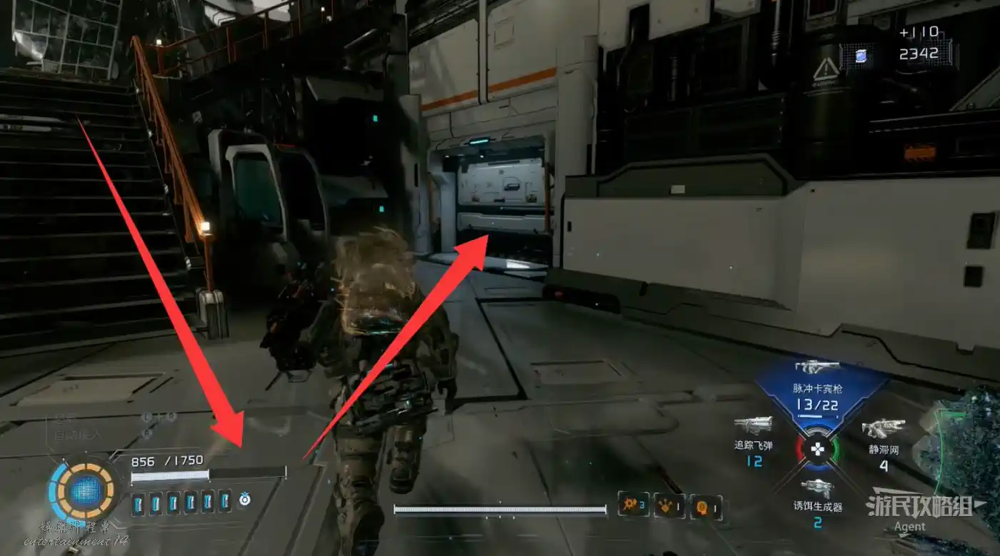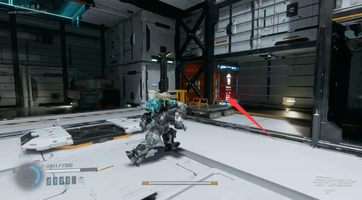 小貓劇情後,遇到蜘蛛機器人,前面走到頭角落裡有個【升級組件】,然後走下圖右邊的門。