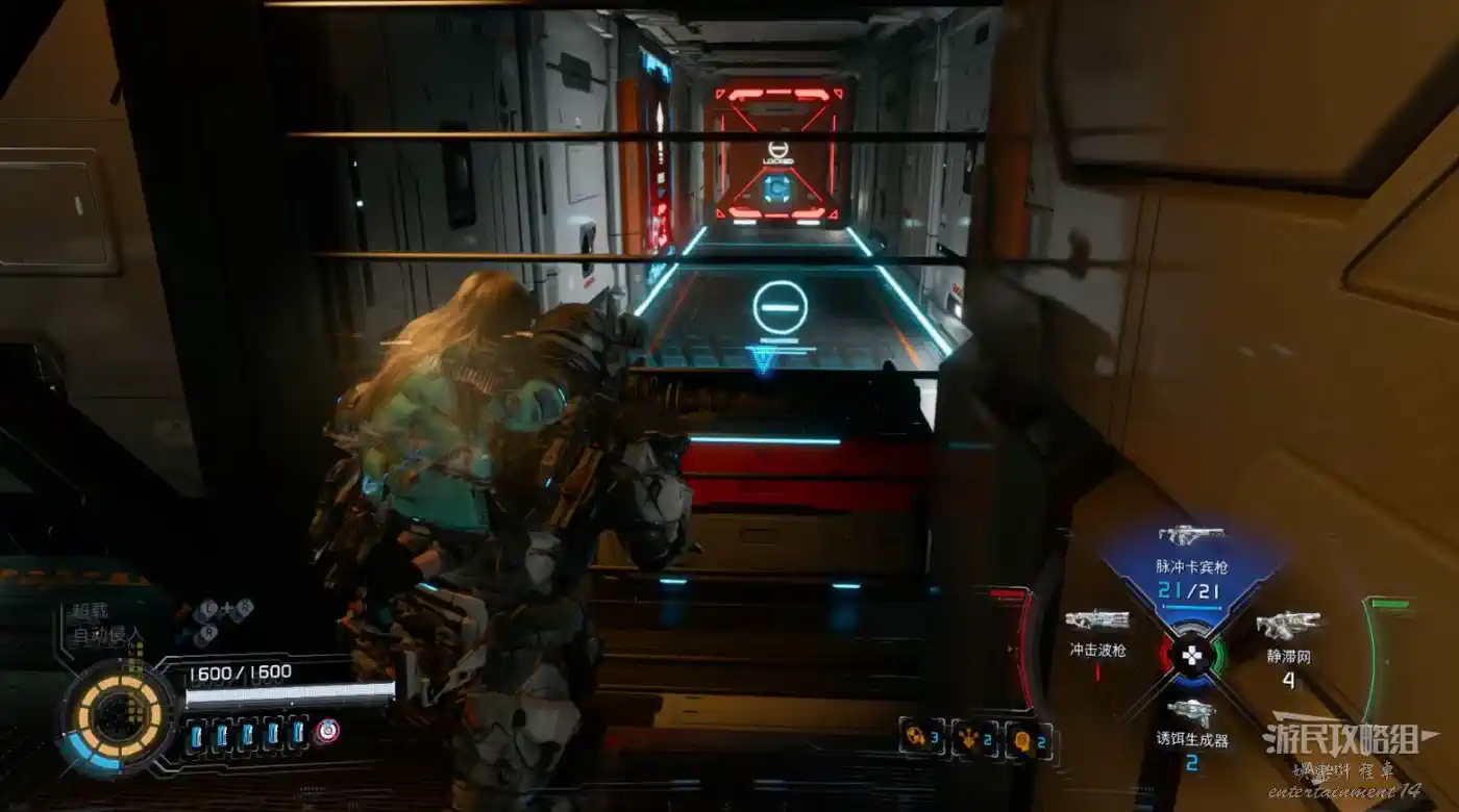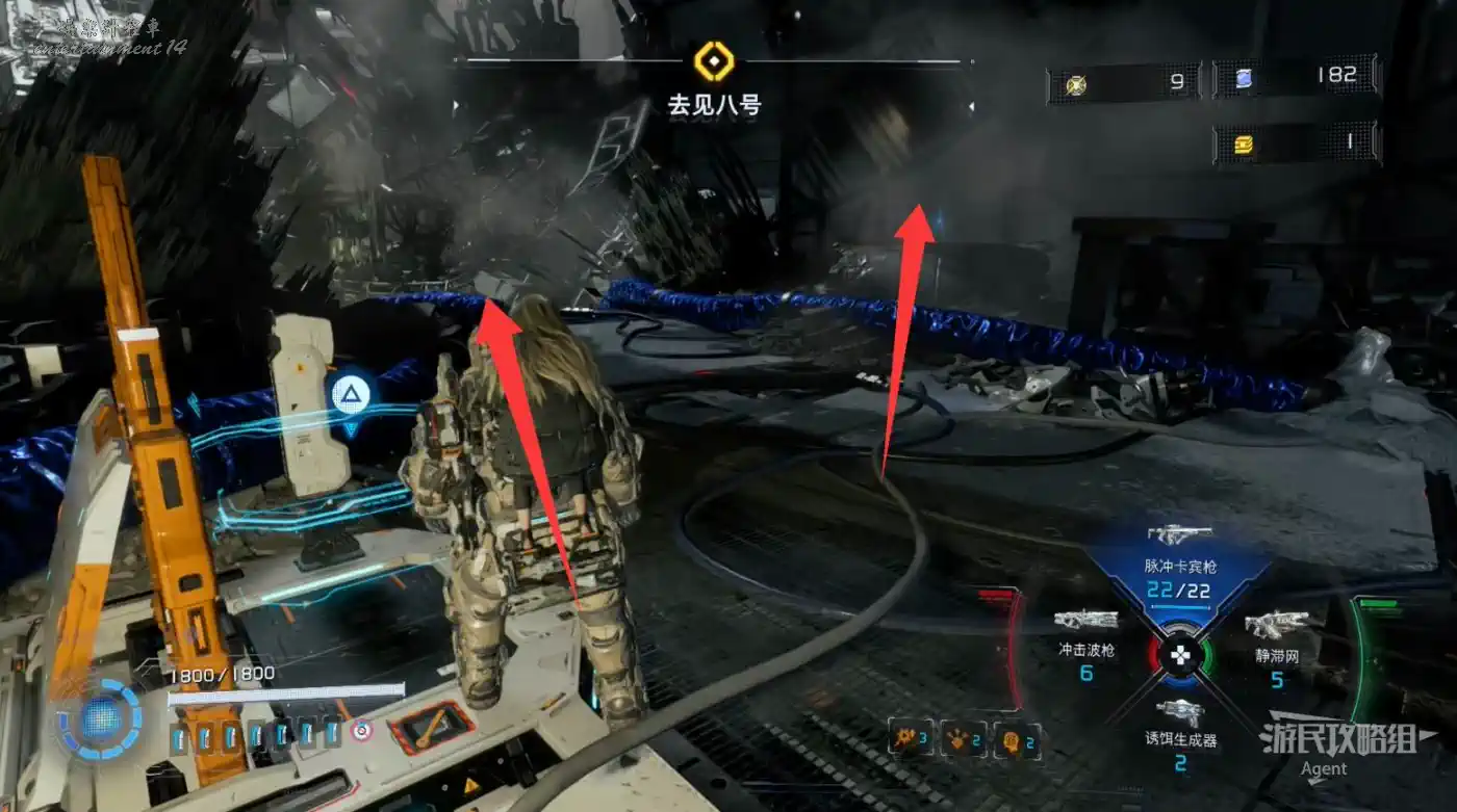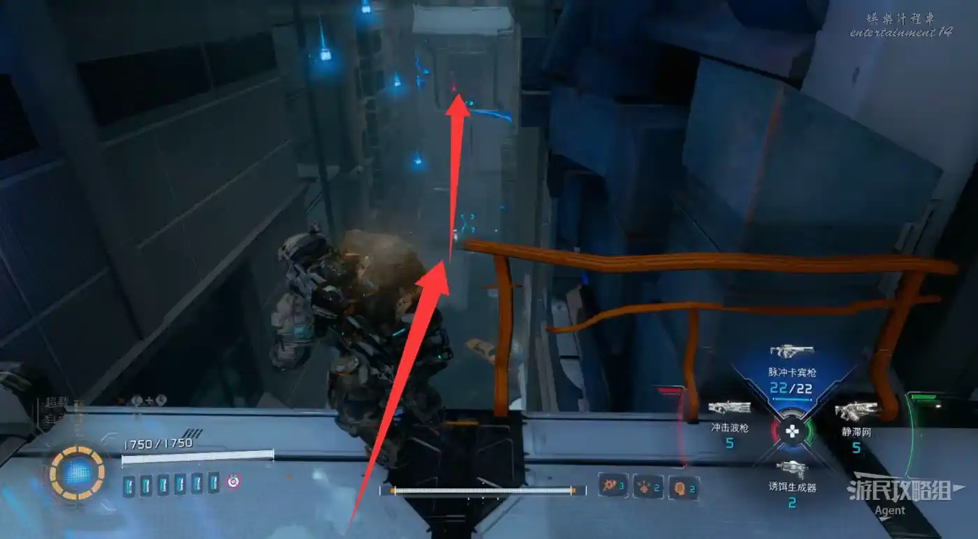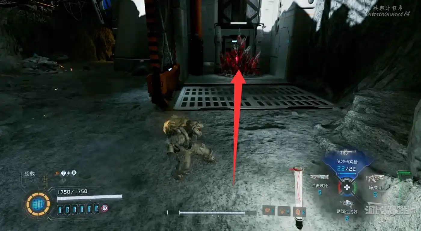 小貓劇情後,遇到蜘蛛機器人,前面走到頭角落裡有個【升級組件】,然後走下圖右邊的門。