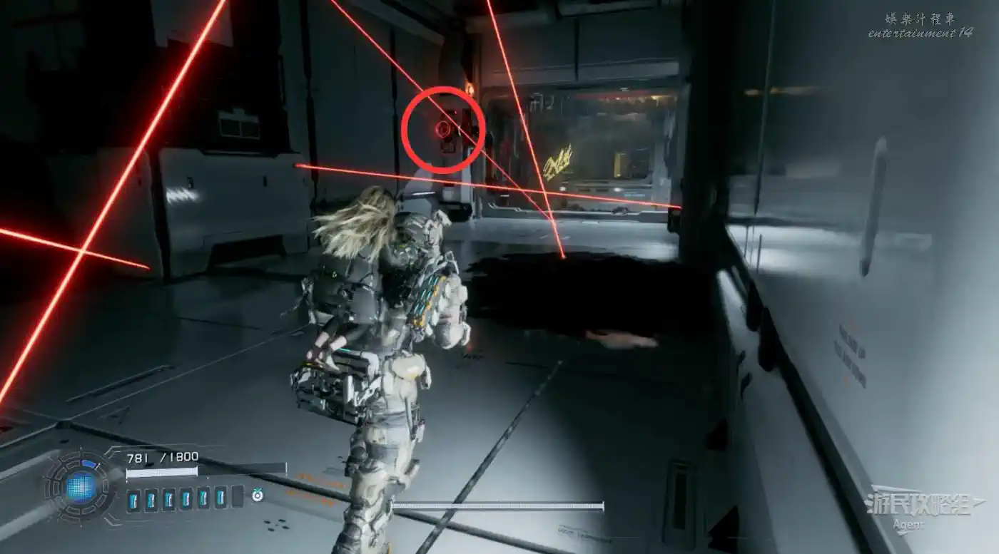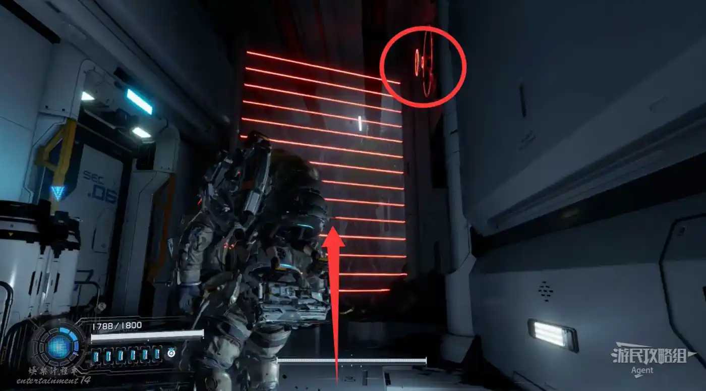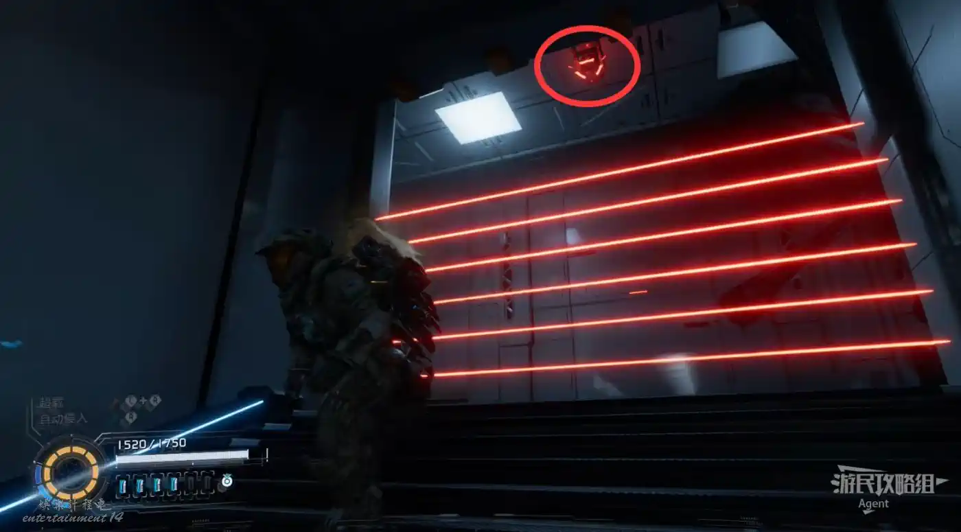 過橋來到有五個鎖的門口,抬頭看背後,破解高處的紅圈關閉鐳射。(同時看到高處還有個升級組件,等下再去拿)