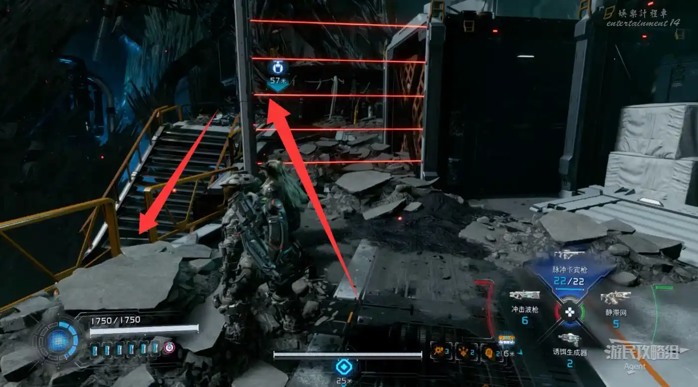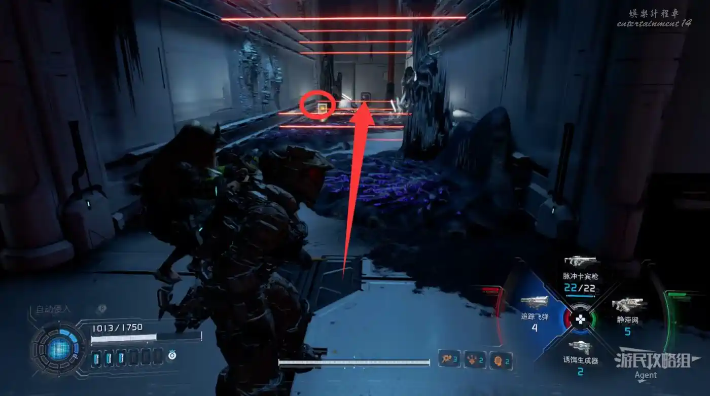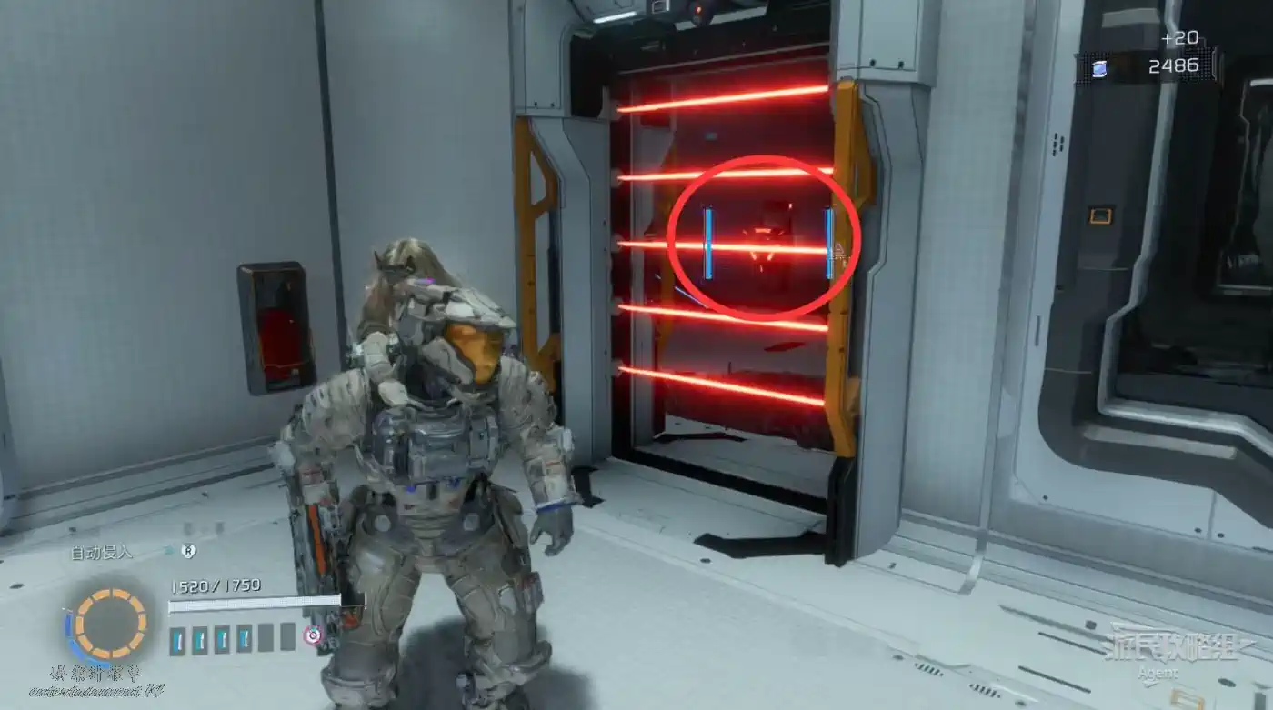 過橋來到有五個鎖的門口,抬頭看背後,破解高處的紅圈關閉鐳射。(同時看到高處還有個升級組件,等下再去拿)