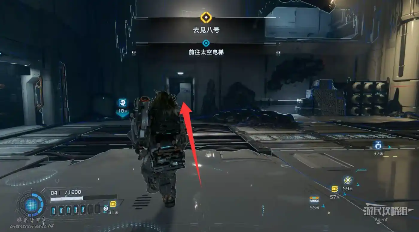 開門往前走,走下樓梯時注意路邊有個【升級組件】。然後去乘斜行電梯往下。
