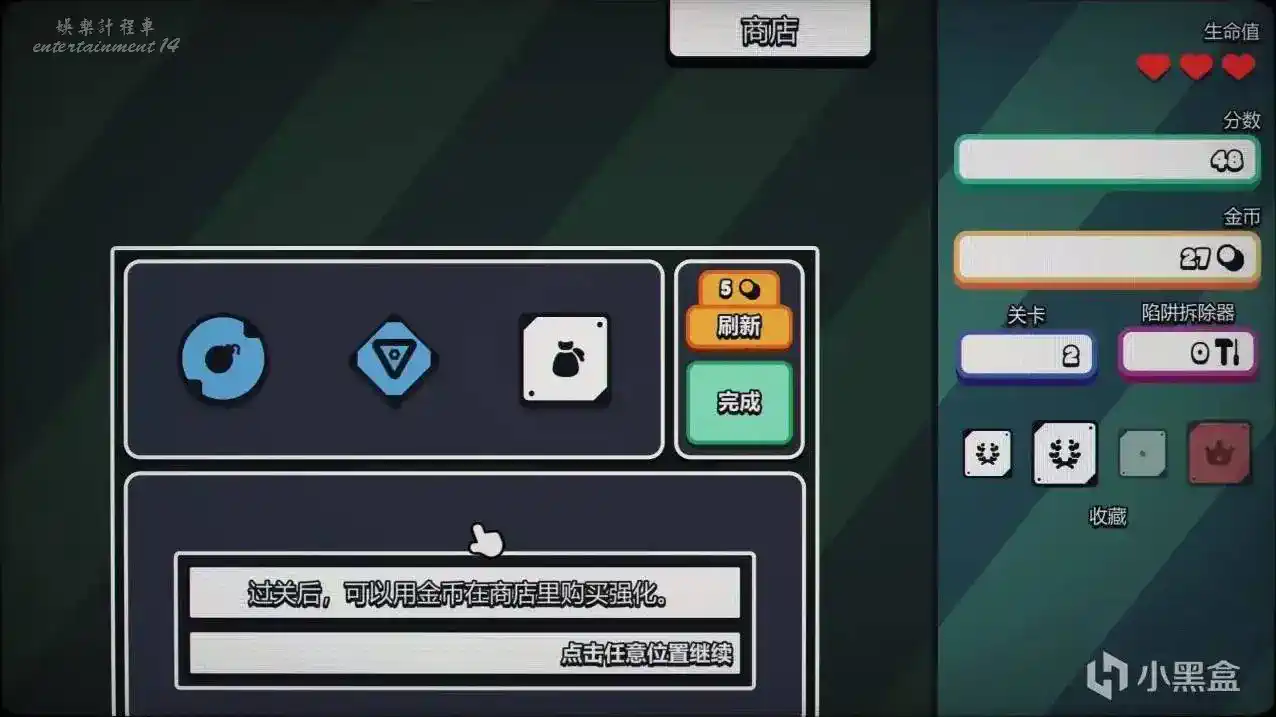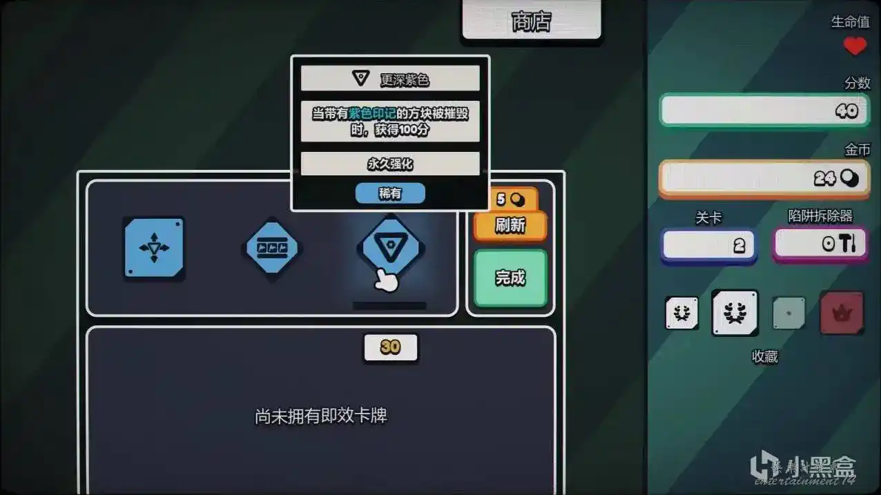 遊戲內置了數十種不同的體系,近300種方塊收藏、強化件和卡牌詞條。除了依靠卡牌暴力掃雷,你同樣需要考慮長線的運營。很多時候,你不僅僅只是思考哪裡有雷的問題,而是要琢磨怎麼做才能讓收益最大化。在遊戲中,時間就是金錢。以前掃雷追求手快是為了打破自己的個人記錄,現在是為了賺錢,通關越快,你拿到的金幣就越多,直接決定了你能否在商店裡順利刷出、組合出你想要的Build。