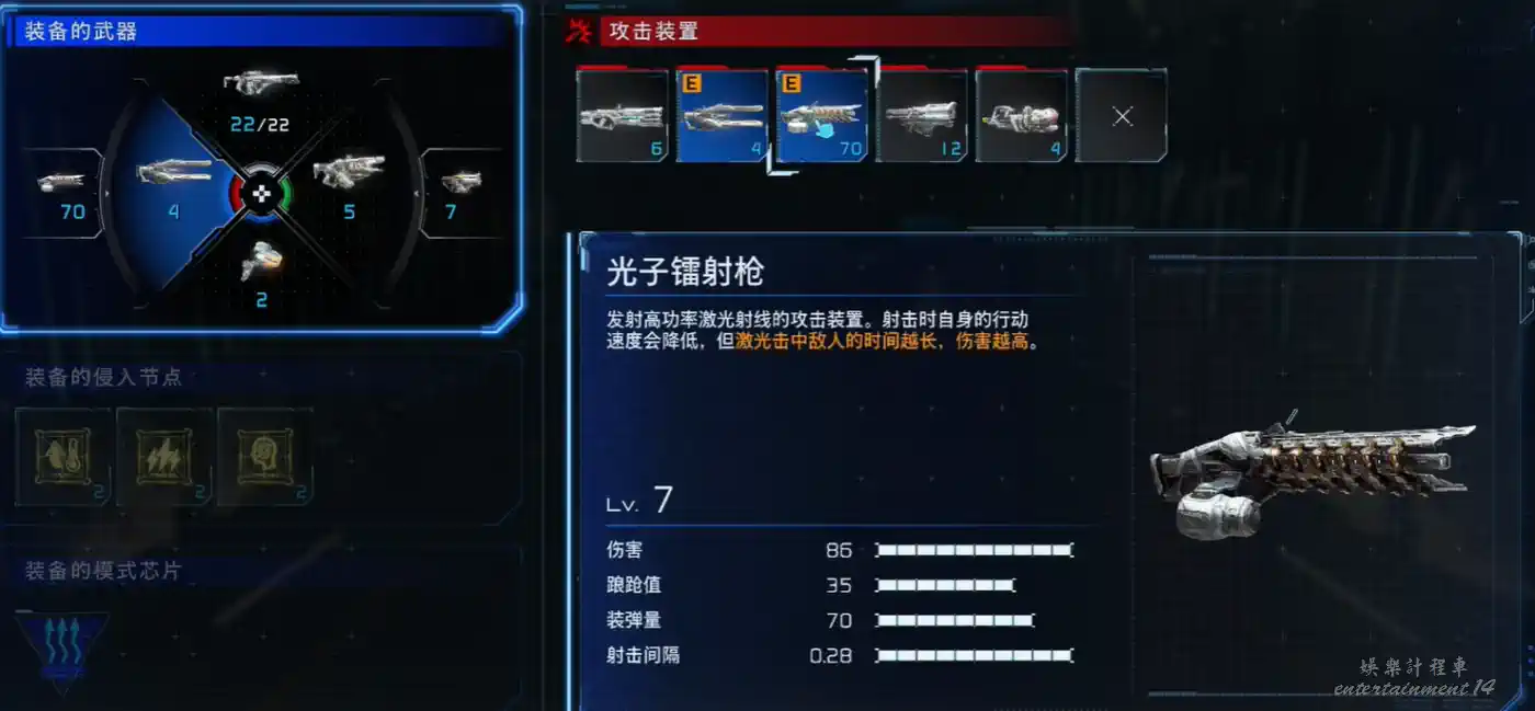 優點:按住鐳射不鬆手時傷害會持續飆升,尤其是BOSS被打暈/破解後,對著弱點持續射能直接打穿血條,裝彈量多,不怕斷輸出。