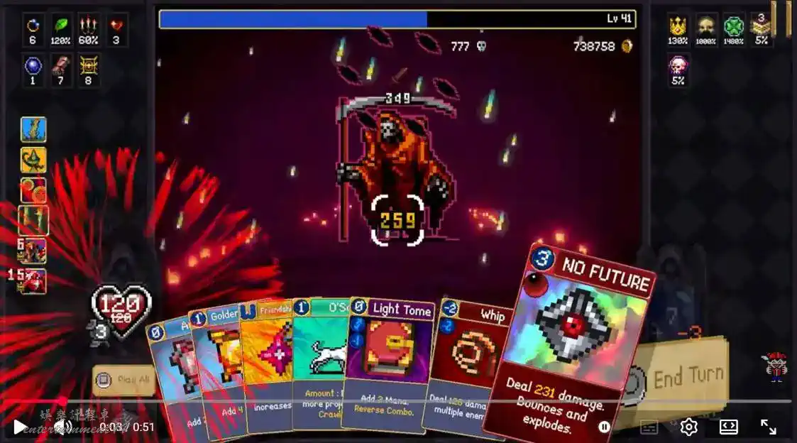 紅死神在demo時期強度很丟人(笑)一回合只能打100並且出現後不會先給你一巴掌,所以只要疊血量然後迴圈卡組就能過(不過打了也沒啥用就是了,打完會刷下一個紅死神然後一直持續下去)