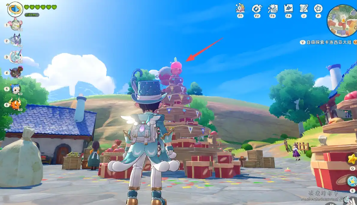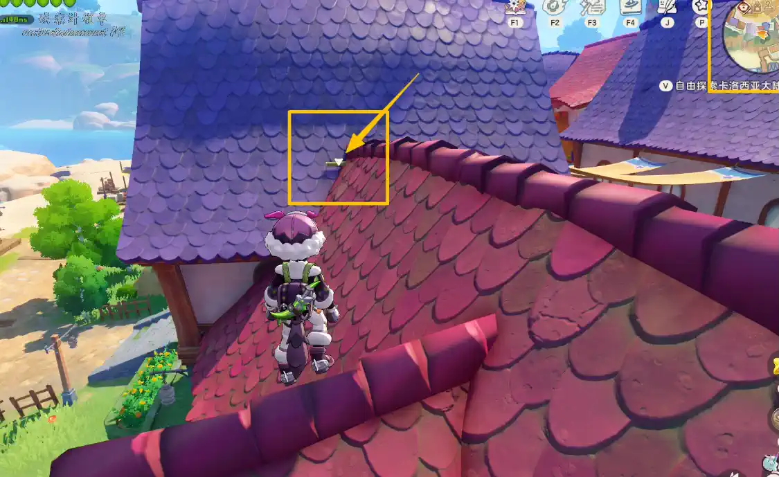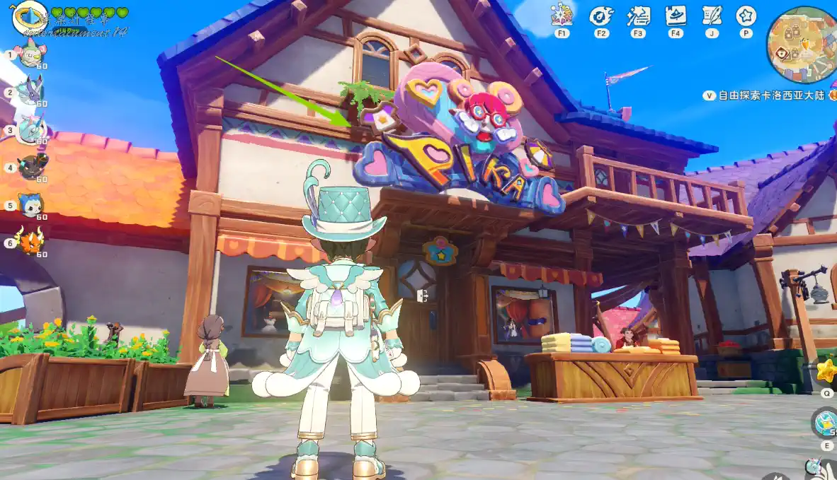 3、得知謎語為:漂亮服飾背後的秘密。去皮卡的服裝店。飛到皮卡的服裝店招牌後拾取道具。
