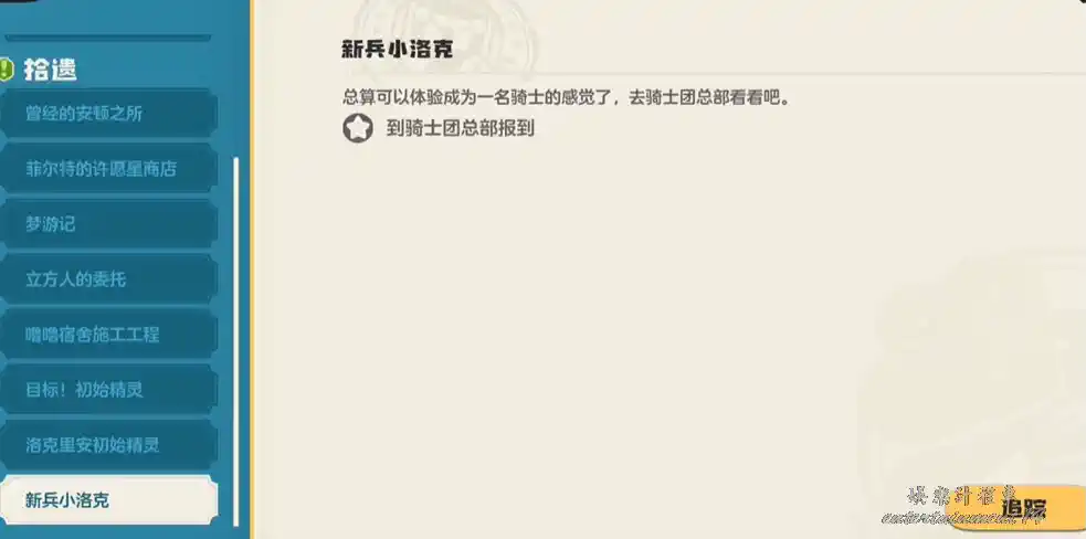 按 ESC → 任務 → 最下方 “陣營” 標籤,找到騎士團支線 “新兵小洛克”。