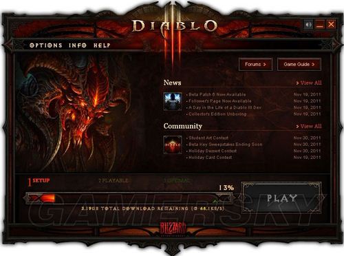 第二步更新完成之後,就會彈出上圖所示的暗黑3風格的安裝界面。 Diablo的logo下面有三個按鈕,很明顯,最大的那個就是安裝;下面左邊的按鈕是一些說明,會連接到官方網站的資料頁面;右邊的是退出安裝。 在這裡,我們點擊”INSTALL”按鈕來繼續安裝暗黑3.