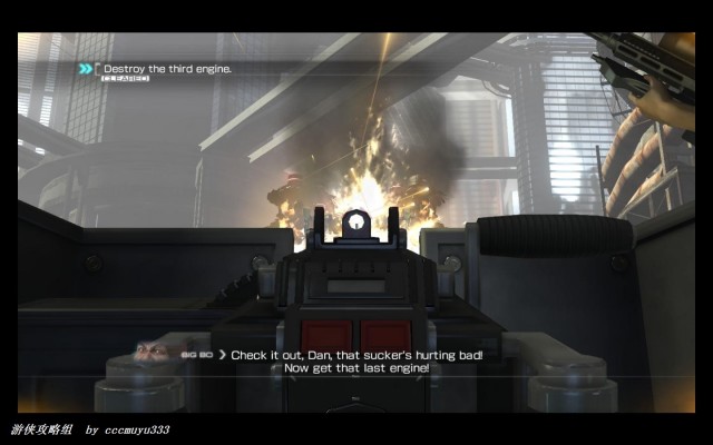 7:之後來到指定地點,控制高射砲;這裡要利用高射砲清光敵人,注意優先清理大塊的機器人,最後兩個BOSS,一個天上打爆,一個地上打爆;有些小機器人砲彈打不到需要你按E鍵近身攻擊。