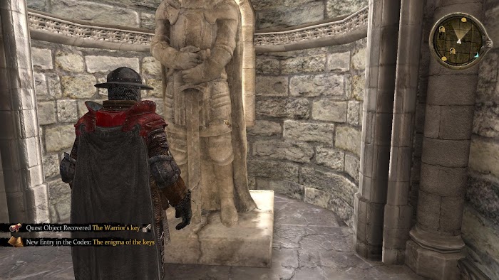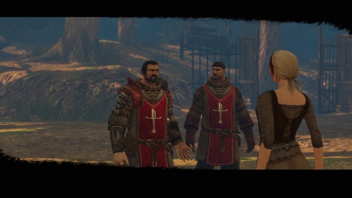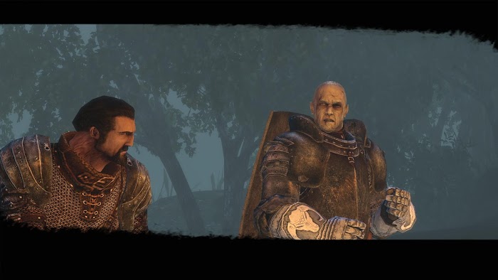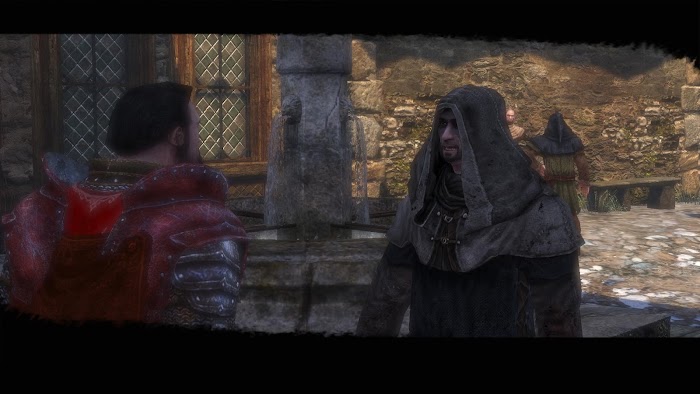 這一章節劇情很簡單,更多的是學會用愛犬尋寶。死裡逃生的黑哥在隊友的幫助下恢復知覺。先感謝隊友的救命之恩,並接到命令趕回黑堡。不過不能忘記那個第一章留在陽臺上的新兵。只留下一個弓,沒有血跡,嗯~按R讓愛犬嗅著氣味追蹤即可。來到城堡外的森林,在橋邊遇到一個可疑人物。接著探索,發現一夥自稱商人的盜賊,並企圖暗算黑哥……嗨~這不是自投羅網嗎???不知天高地厚的笨蛋們,哪知道遇上黑哥是他們最大的不幸。拷問出2處埋金子的地點後滅了他們。接著就是找那個新兵,還是用愛犬繞過障礙找到。這個傢伙不學好,竟然光天化日下搶劫民女!!!!愛犬馬上沖上去殺了他……反正逃兵都是要斬首的……死有餘辜。好吧,找到埋藏的金子後返回黑堡。這時有了積蓄和東西,可以到大廳一樓的商人哪裡購買合適的裝備和藥物。更換完裝備後來到2樓,正巧遇到樓梯口一位雕刻石像的老兄,對話中選擇接受他的夢想,可以開啟尋找餘下6個石雕的任務,都搜集好了給他就行。效果等完成任務才能知道。接著跟黑老大對話,他把啊倫首相的信交給黑哥。看過信得知,這個老首相,老兄弟(主角和首相曾在一起戰鬥過)還是那樣老辣,用帶密碼的信件讓黑哥照顧一個女人,當然女人的地點只有黑哥知道。黑老大寒蟬一句後,同意了首相給黑哥的任務,並提示主角如果有問題馬上返回黑堡。來到大門,遇到首相的親信,旁邊那個中尉有點不友善,不過暫時不用在意。正當大家準備出發之時,黑老大帶來了不好的消息,烏鴉傳書說首相阿倫已經去世了……