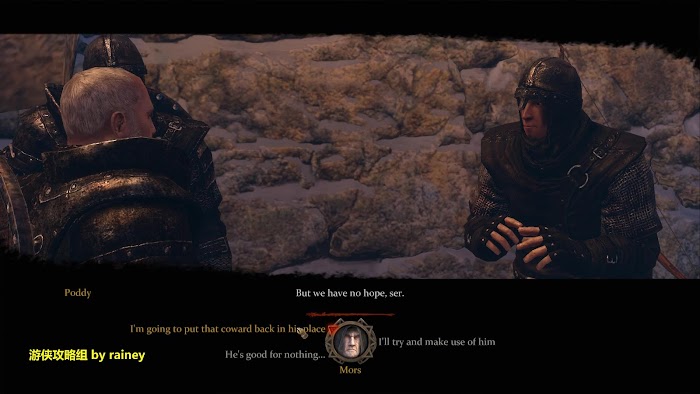 如果你問我權利的遊戲為什麼如此危險,我的回答其實很簡單,因為你不能相信任何人。本章充分表現了權利遊戲中的忠誠與背叛文學,請隨我一同回到寒冷的北方高牆。哥瑞克(第三章代表首相到黑堡來送信的人)和主角按計劃啟程前往莫爾斯鎮(高牆南部路徑王者之路的重要城鎮,也是高牆附近唯一有“娛樂園”的地方)。路上遇到個瑞克的手下,幾個不友善的傢伙,不過我重感覺他們不對勁……我的預感一直很靈驗,但是這次我只有預感,卻不知道為什麼……救下路人後繼續前進。來到城鎮的“娛樂園”,首先和女掌櫃說話,如果耐心和細緻,可以套出目標女孩的位置,就在路過廚房後的地下通道深處(你問為什麼人們生活在地下?遊戲裡解釋了,為了禦寒)。下去前最好和兩個黑衣守護兄弟說說話,聽聽他們的故事,原來每個宣誓的兄弟都有一個不尋常的故事。地道裡遇到2個走私販,感覺沒有必要殺了,對主線好像沒什麼影響。接著找到女孩,她的第一反應竟然說不認識我身旁的個瑞克……我靠……預感果然靈驗了……NND我的第一反應是剛才遇到的他的一隊聽話的手下,瞬間全變成敵人了……我查,戰略上迅速被動了……沒辦法,擊敗這個小人,不過沒死竟然逃跑了……還不斷派出小兵阻攔。護送女孩殺出地道,你不要問我為什麼要保護女孩……(1)人家是女孩,所以我保護……(2)敵人費了好大勁就是為了抓她,所以為了查明真相更不能隨便放了目標。(3)你們難道不想英雄救美嗎???好了~出來遇上殺得正歡的兄弟派翠克(小派),聽完解釋後迅速加入戰鬥。連路消滅敵人,接著來到森林。這裡兩種方法,一是用愛犬從背後撲上去一個一個暗殺敵人。二是大軍壓上……好吧,明顯敵人很多,第一個方法更好……慢慢消滅很多敵人後,走過木門,看到了之前黑堡派出的3個兄弟。激烈的戰鬥過後,我這下克放心了,至少人數多了……誰知,我的預感又來了……我查,不會吧……趕緊存檔,幾分鐘後3人竟然對我和小派舉刀!!!NND一個破錢就把你們的信仰買了???可惡,沒有辦法,只好自衛把他們殺了……終於帶著沉重的心情回到黑堡,見到黑老大後解釋情況。黑老大很是震驚,並帶來敵方俘虜。原來收買黑衣眾的命令也是那個賤人個瑞克下達的,我們可以選擇殺死他們還是讓他們加入黑衣,壯大自己,相信後者從戰略上來說會比較明智吧。