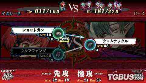 然後是選擇武器 ,這是戰鬥的重點所在,ATK06代表武器的威力,M字樣則是攻擊後支援圈的大小(從小到大分別為XS、S、M、L、XL),Bad字樣代表與敵方武器之間的相剋屬性(Good表示克制對方武器,Bad被克制,沒有字樣則無克制關係),不但對殺傷力有影響,也決定了戰鬥後哪一方被彈開。