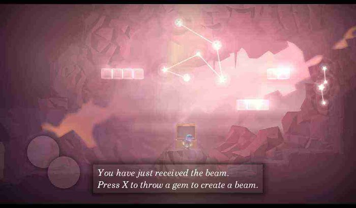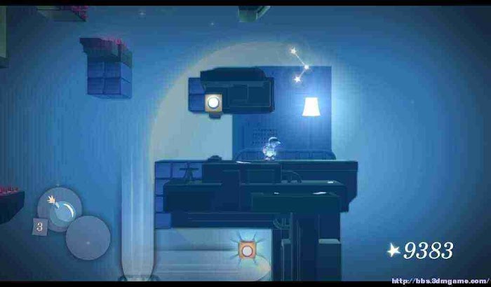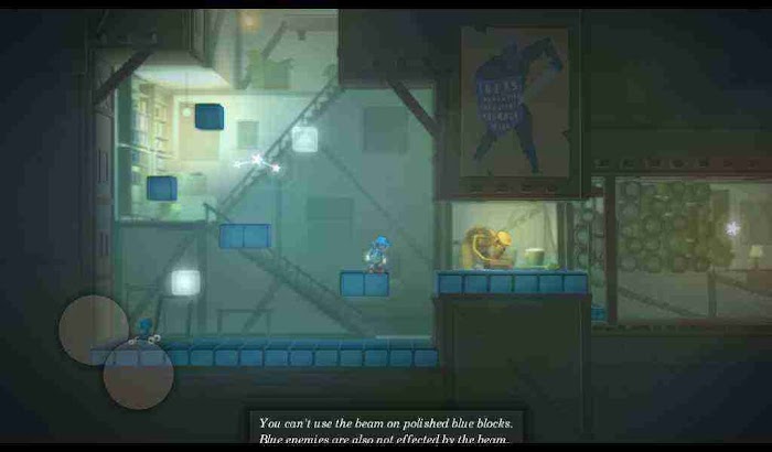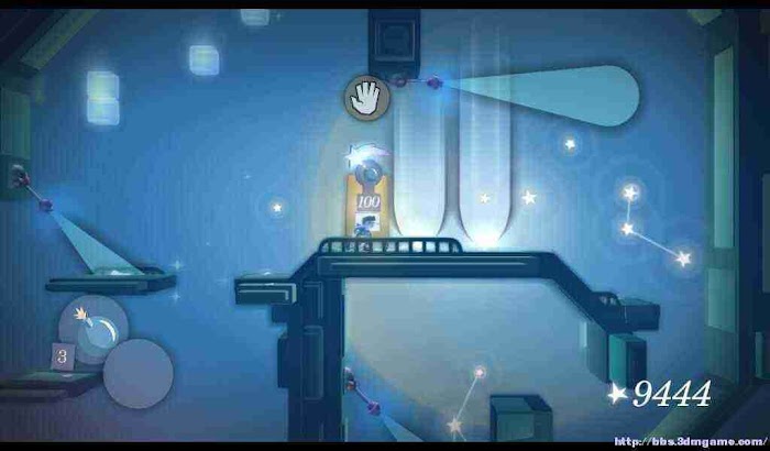 藍色的磚塊無法放置光束,所以下圖的場景只能利用有限的非藍色磚塊投擲光束從而讓其漂浮到最上層