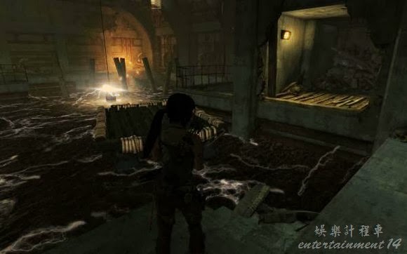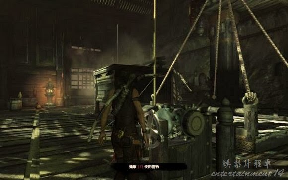 攻略:此場景有4個油桶,但是3個就足夠讓翹翹板翹起來並支撐到羅拉跳去對面岩壁了.一開始地面有一個,可以立刻扔到翹翹板上.第二個油桶可以再左邊翹起的鐵板那跳過去對面平台,平台會立刻坍塌,油桶會掉落. 第三個油桶在入口的右手邊.先用火把燒掉3具屍體掃清道路,然後站在如圖方向用弓箭拉重物,讓其搖晃撞擊平台獲得第3個油桶.