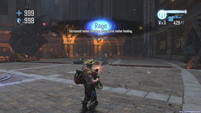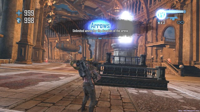 之後進入競技場之前的區域。這裏玩家一定要先瘋狂沖到出口出的臺階之上死死守在高處攻擊,不要在開闊處;否則會被四面沖來的敵人圍死